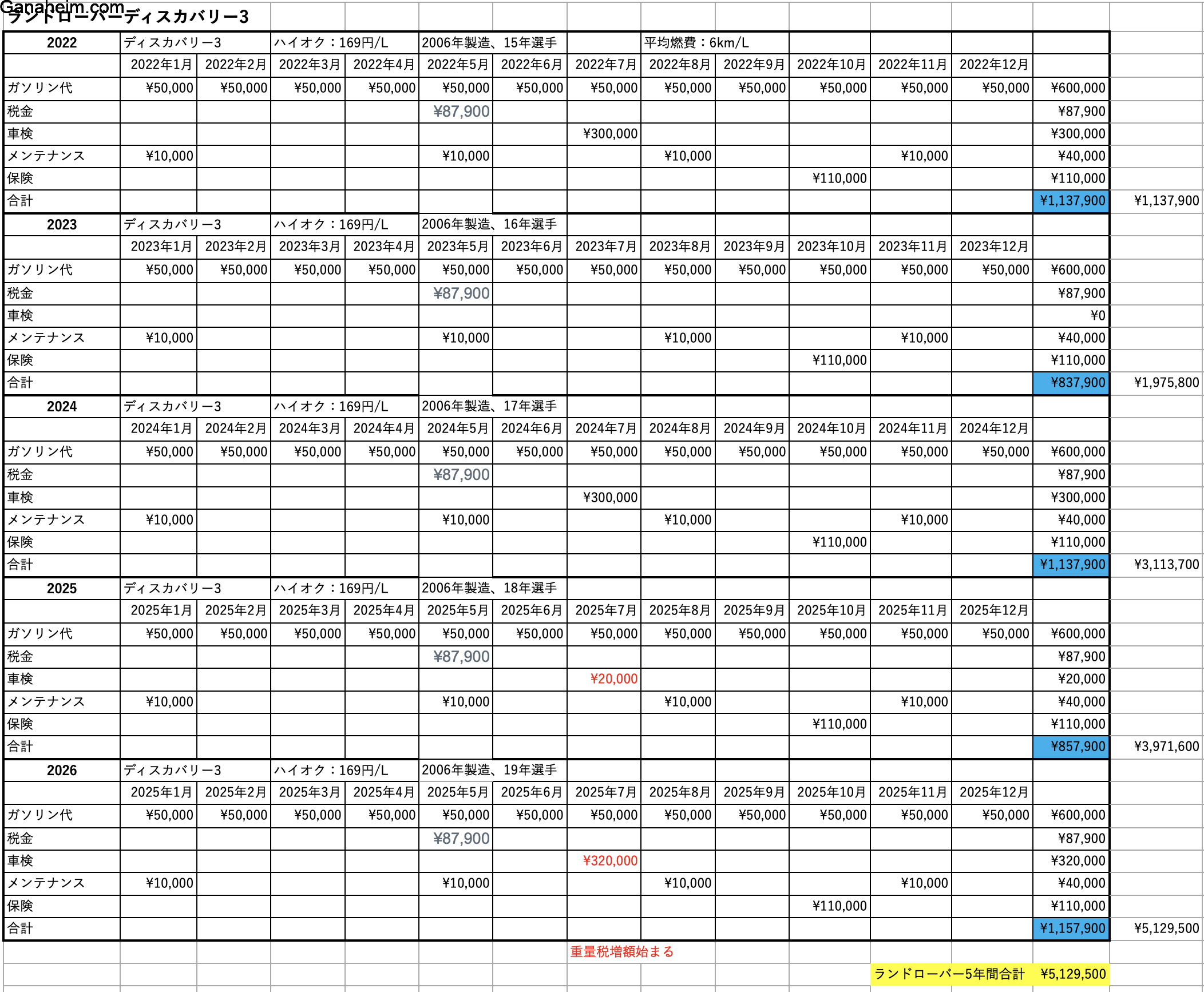 今後5年間ディスカバリー3を所有したらかかる費用はこんな感じ。