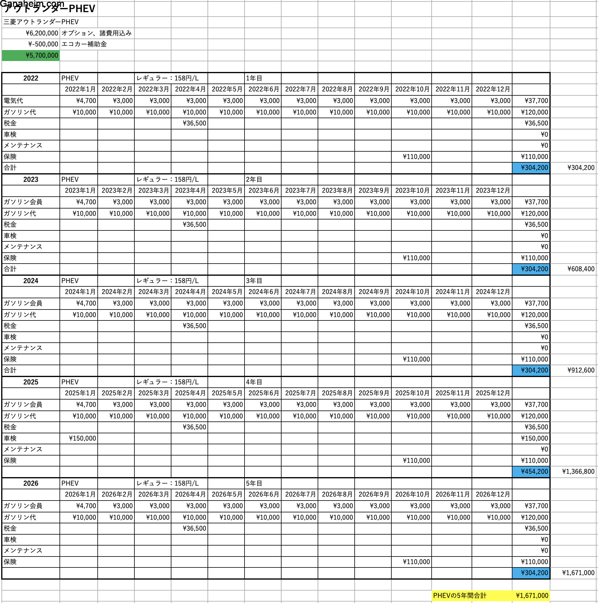 こちらが次期候補車両の三菱アウトランダーPHEVの維持費です。