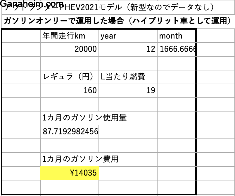 - アウトランダーPHEVだとHVとして運用した場合1.4万円の燃料費